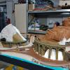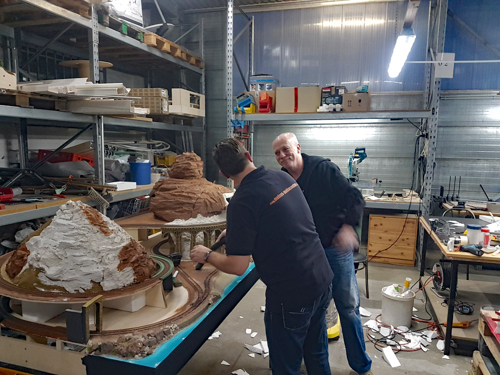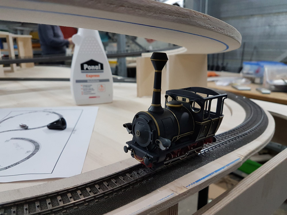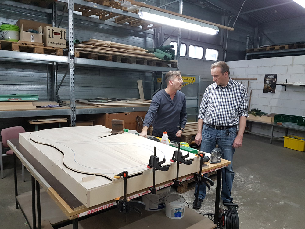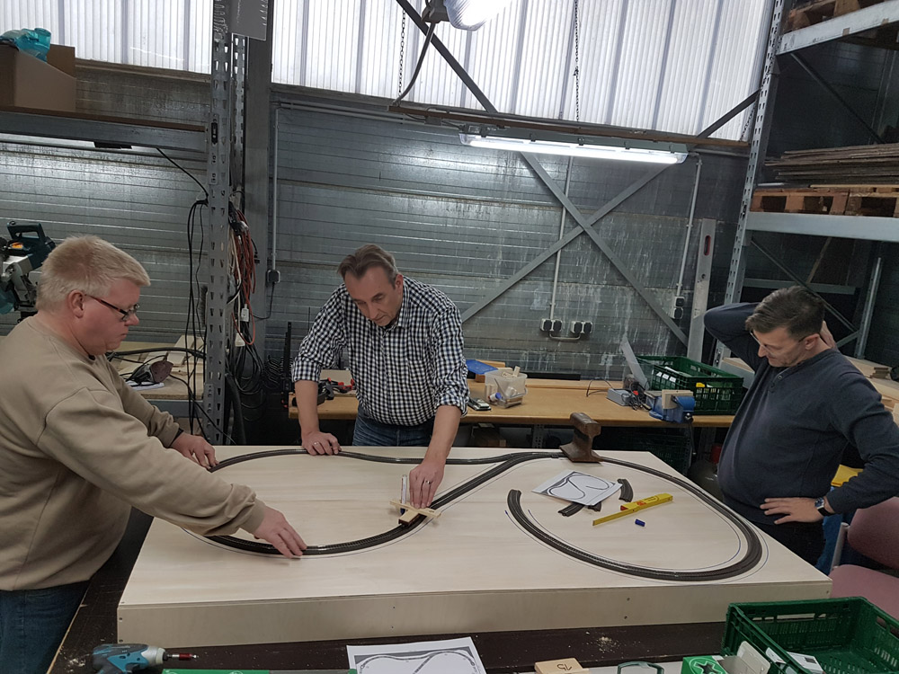 Am Samstag (10.03.2018) haben wir 4, Christian Hanke + Rüdiger Roitzsch vom Märklin H0-Forum, sowie Stephan Klinkforth (Freund+Kunde von MMC) und meine Person (Guido Meißner/MMC) mit dem Bau der Anlage begonnen. Den Gleisplan habe ich mit Wintrack 13 geplant und mir durch die 3D-Ansicht bereits vorweg eine gewisse Vorstellung der Anlage machen können. Den Rahmen haben wir (wie bei MMC gewohnt) aus 15mm starkem Multiplexholz (10-12cm hoch) gebaut. Da die Anlagengröße mit 180 x 100 cm relativ klein ausfällt, war der Rahmenbau schnell und einfach erledigt. Ich habe bewußt versucht die Anlage so klein wie möglich zu gestalten, da Sie nach Fertigstellung in unserem Laden in Geesthacht Platz finden sollte und wir auch zeigen wollten, dass es eben nicht so viel Platz braucht um eine solche Anlage zu bauen. Fast alle Gleise stammen aus der Startpackung 29179 (Jim Knopf) und ich habe versucht nur Standardgleise zu verwenden (siehe Gleisplan). Trotz der enormen Steigung von 6%, um tatsächlich auch im Wendel 12cm Höhenunterschied zu erreichen (12cm sind leider notwendig aufgrund der Höhe von Emmas Schornstein), konnten wir komplett mit dem C-Gleis 24130 (R1) arbeiten.