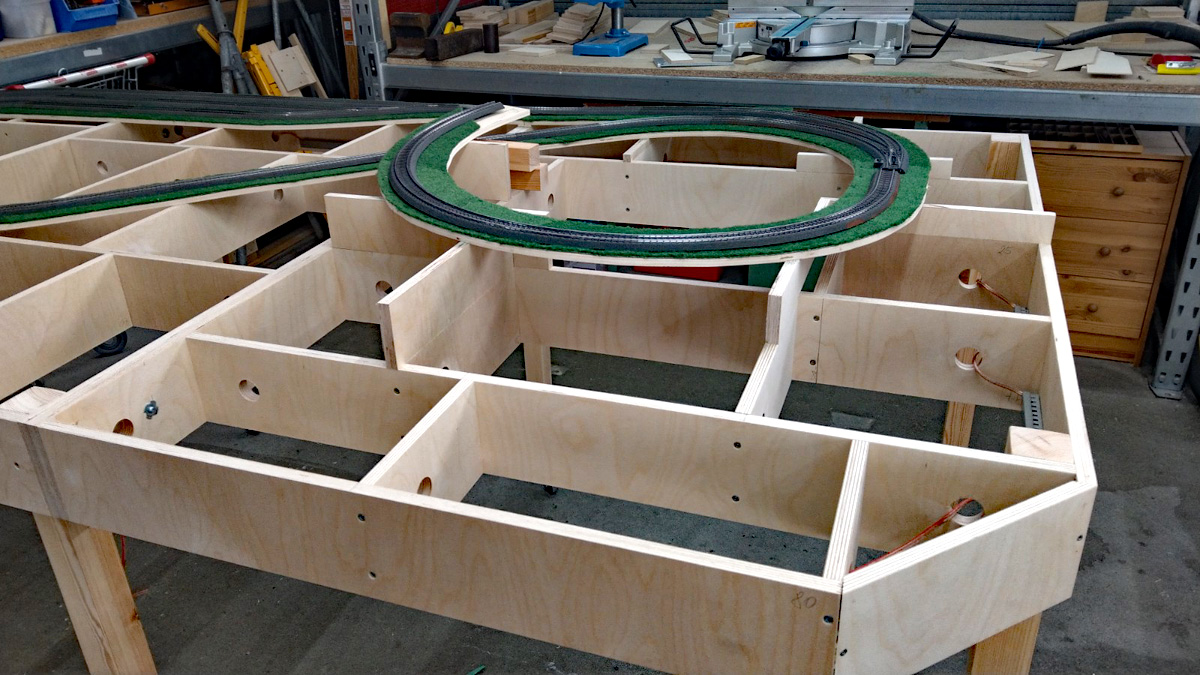 Wie bereits in den Grundlagen erwähnt, ist unser bevorzugtes Material für den Rahmen "Multiplex" 15mm bis 20mm (je nach Anlagengröße und Oberbau). Rahmenhöhe ist in der Regel 12cm oder mehr. Dieses Material ist durch die Mehrfachverleimung sehr stabil, relativ Temperaturunempfindlich und lässt sich sehr gut verarbeiten. Auch ausreichend Kabellöcher (30-35mm Forstnerbohrer) sollten vorhanden sein bzw. gesetzt werden um später die Ringleitungen und sonstigen Verkabelungen gut verlegen zu können. Die Stützen/Füße bauen wir in der Regel aus 44x44mm oder 50x50mm Leisten/Kanthölzer mit verstellbaren Gewindefüßen (M8 Gewinde) oder feststellbare Rollfüße/Stützen.